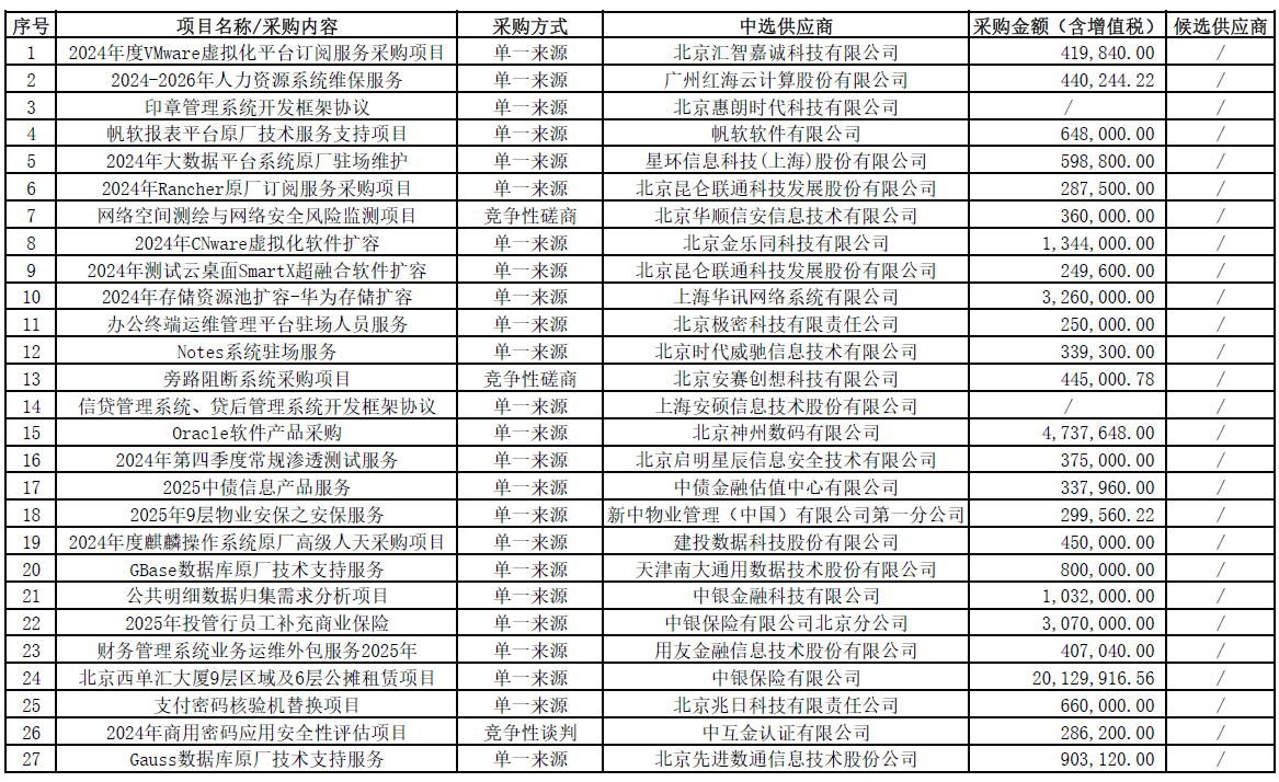 中银富登村镇银行股份有限公司采购项目结果公示(2024年11月-2025年1月)