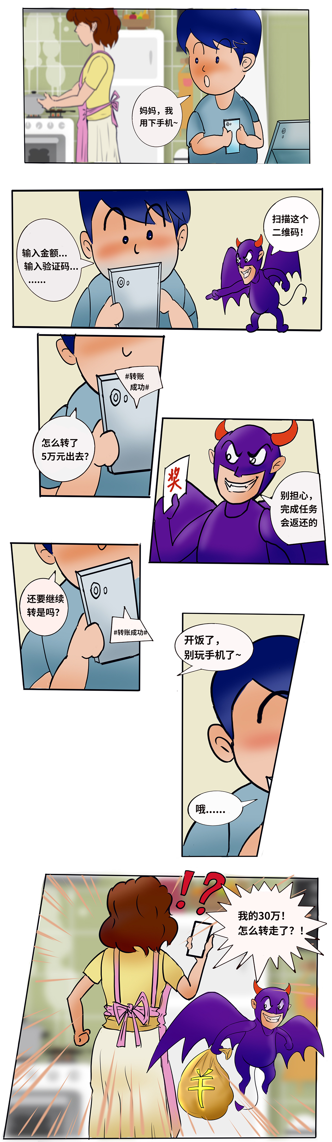 近日,广西某地发生一起关于小学生的电信网络诈骗案,导致家长账户内30万元现金被转走。本图内容以真实诈骗案件改编,在此提醒广大家长,注重培养孩子的风险防范意识,切莫轻易落入电信网络诈骗魔手。