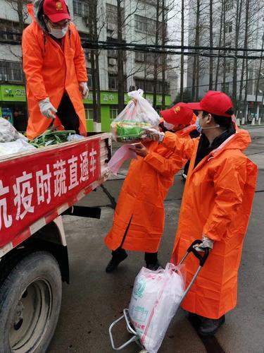 图为潜江中银富登村镇银行的战“疫”爱心助农小分队的队员们,组织“抗疫时蔬直通车“,将农户种植的蔬菜直接运到社区居民门口,解决疫情期间农民”卖难“和市民”买难“的问题。 王潇雯 摄