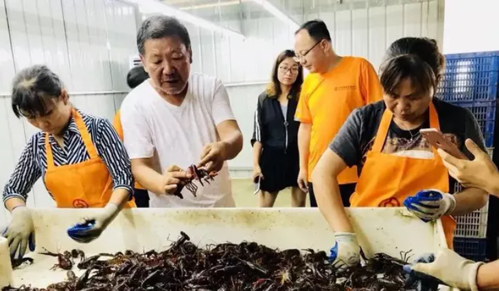 ↑图为中银富登的无抵押专项小龙虾养殖贷款让陈居茂(左二)两年时间实现养虾规模、效益大翻身。