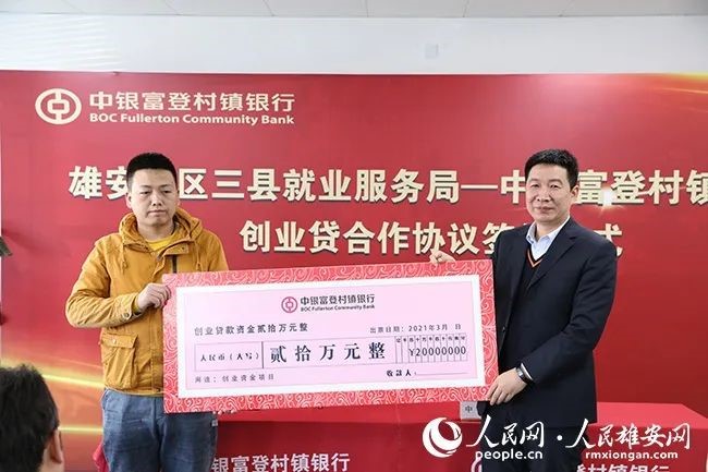 当天,雄安新区雄县、容城县、安新县就业服务局分别与中银富登签订了《创业贷款合作协议》。同时,中银富登与创业贷客户签下首笔借款合同,并现场发放20万元创业贷款。