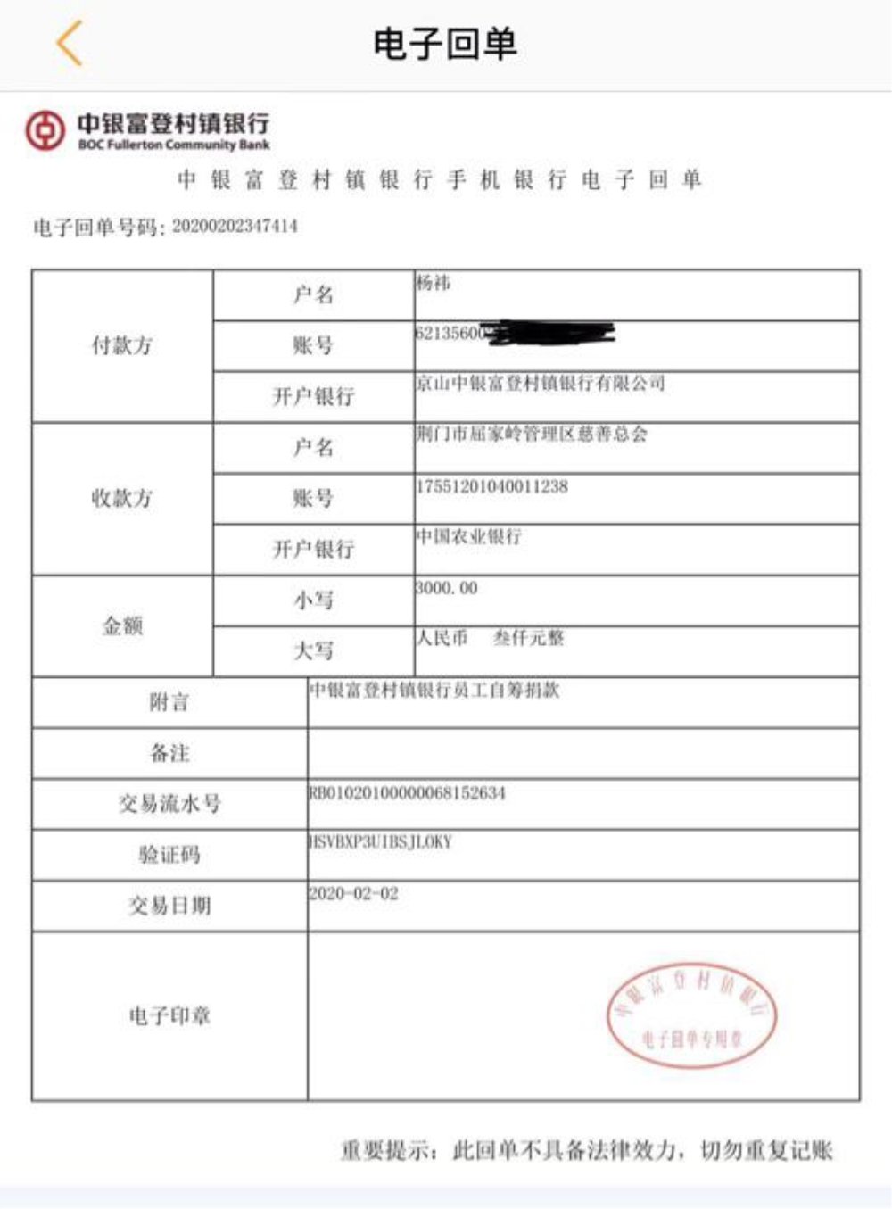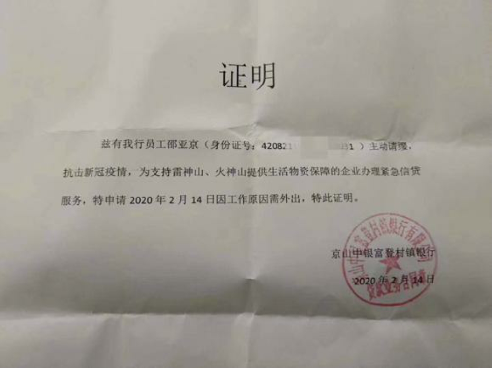 新冠肺炎疫情打乱了原本的生活秩序,休假时间延期至2月13日。京山中银富登村镇银行客户刘某因参加竞标的是全国公开网上竞标项目,时间无法顺延,年前申请的210万元贷款,需要立刻放款且必须在2月6日前转入竞标账户。京山中银富登村镇银行得知后,及时向总部申请政策支持,运营员工及客户经理刘盼克服“全市居民禁足”、“对外不营业”、“钥匙被隔离”等多方困难,2月3日19时30分运营成功发放贷款50万元,2月4日总部运营系统放款160万元,保证了客户顺利进入投标环节。